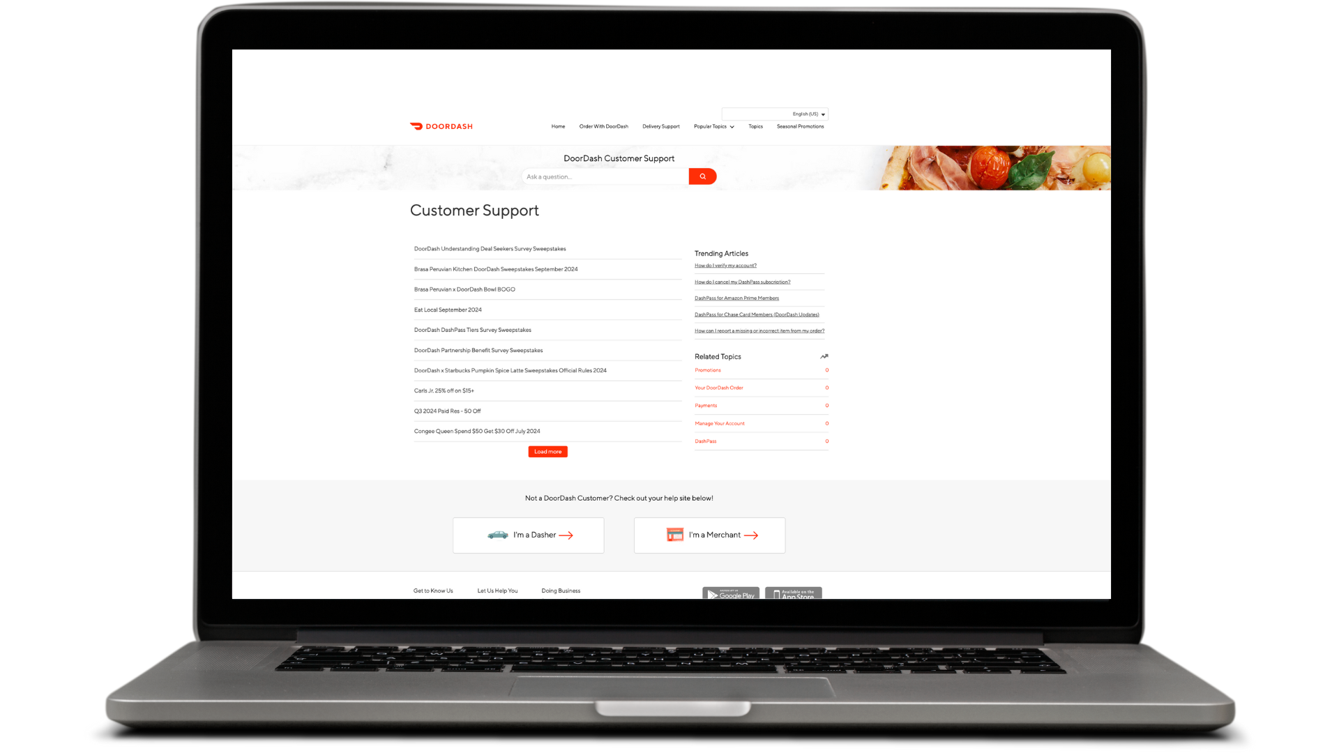 Project Objective: As a designer, I helped build the customer support experience for DoorDash's website. I was responsible for the implementation of key support pages, including FAQs, order issue resolution, account management, and refund requests. This involved designing clear, concise web copy to ensure a seamless, user-friendly experience, making it easier for customers to find the help they need efficiently